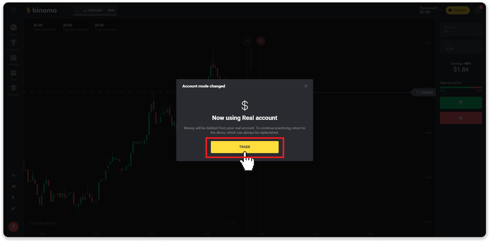 3. Платформата ќе ве извести дека сега користите вистински средства . Кликнете на „ Трговија “.
